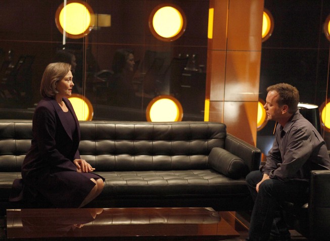24: Jack (Kiefer Sutherland, R) meets with President Taylor (Cherry Jones, L) when she visits CTU in the “9:00 – 10:00 AM” episode of 24 that aired Monday, April 19 (9:00-10:00 PM ET/PT) on FOX. ©2010 Fox Broadcasting Co. Cr: Kelsey McNeal/FOX